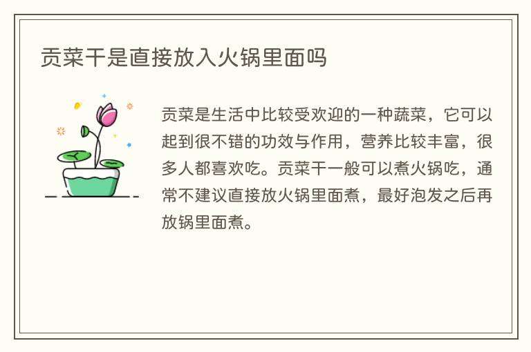 贡菜是生活中比较受欢迎的一种蔬菜,它可以起到很不错的功效与作用,营养比较丰富,很多人都喜欢吃。贡菜干一般可以煮火锅吃,通常不建议直接放火锅里面煮,最好泡发之后再放锅里面煮。