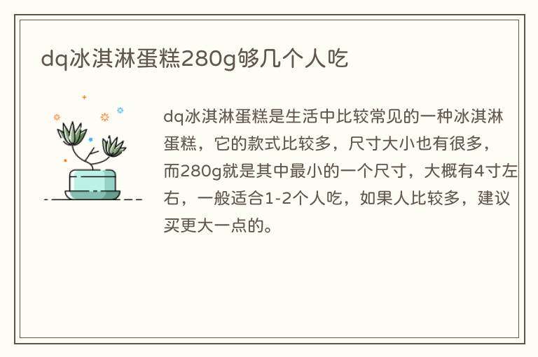 dq冰淇淋蛋糕是生活中比较常见的一种冰淇淋蛋糕,它的款式比较多,尺寸大小也有很多,而280g就是其中最小的一个尺寸,大概有4寸左右,一般适合1-2个人吃,如果人比较多,建议买更大一点的。