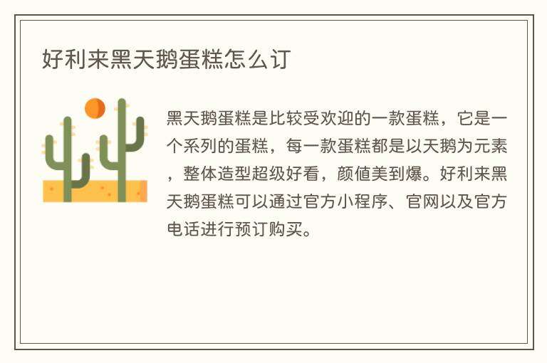 黑天鹅蛋糕是比较受欢迎的一款蛋糕,它是一个系列的蛋糕,每一款蛋糕都是以天鹅为元素,整体造型超级好看,颜值美到爆。好利来黑天鹅蛋糕可以通过官方小程序、官网以及官方电话进行预订购买。