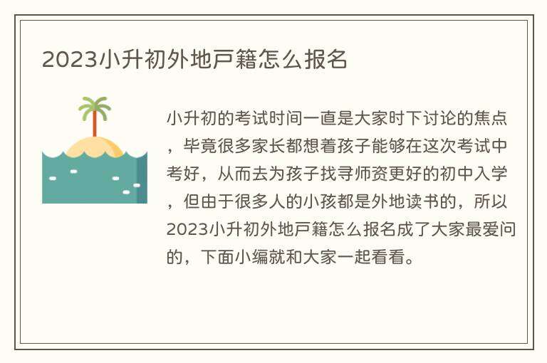 小升初的考试时间一直是大家时下讨论的焦点,毕竟很多家长都想着孩子能够在这次考试中考好,从而去为孩子找寻师资更好的初中入学,但由于很多人的小孩都是外地读书的,所以2023小升初外地户籍怎么报名成了大家最爱问的,下面小编就和大家一起看看。