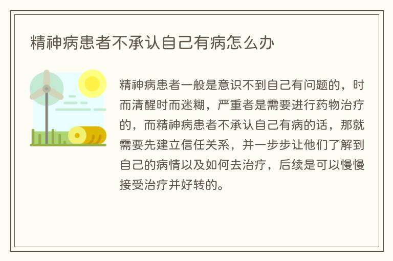 精神病患者一般是意识不到自己有问题的,时而清醒时而迷糊,严重者是需要进行药物治疗的,而精神病患者不承认自己有病的话,那就需要先建立信任关系,并一步步让他们了解到自己的病情以及如何去治疗,后续是可以慢慢接受治疗并好转的。