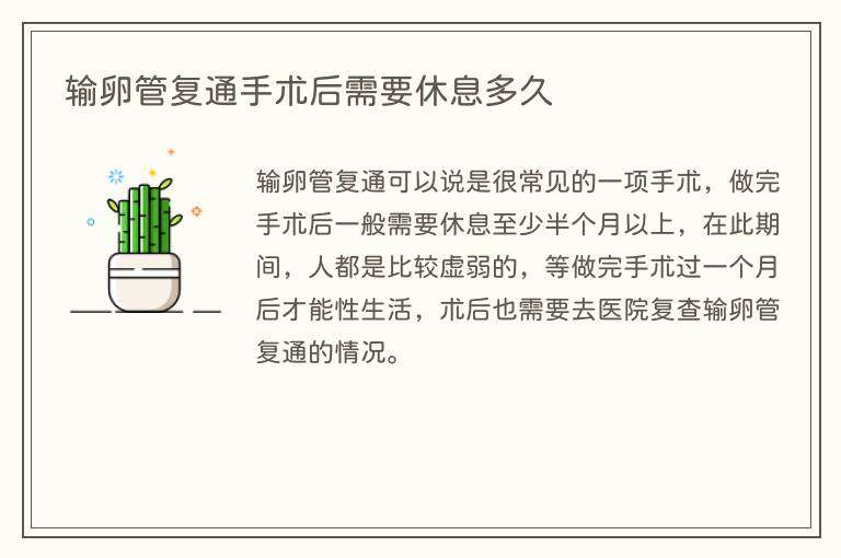 输卵管复通可以说是很常见的一项手术,做完手术后一般需要休息至少半个月以上,在此期间,人都是比较虚弱的,等做完手术过一个月后才能性生活,术后也需要去医院复查输卵管复通的情况。