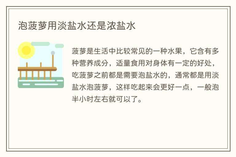 菠萝是生活中比较常见的一种水果,它含有多种营养成分,适量食用对身体有一定的好处,吃菠萝之前都是需要泡盐水的,通常都是用淡盐水泡菠萝,这样吃起来会更好一点,一般泡半小时左右就可以了。
