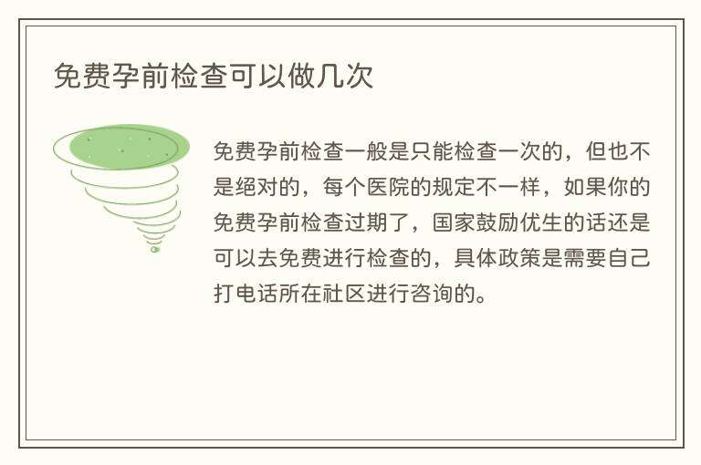 免费孕前检查一般是只能检查一次的,但也不是绝对的,每个医院的规定不一样,如果你的免费孕前检查过期了,国家鼓励优生的话还是可以去免费进行检查的,具体政策是需要自己打电话所在社区进行咨询的。