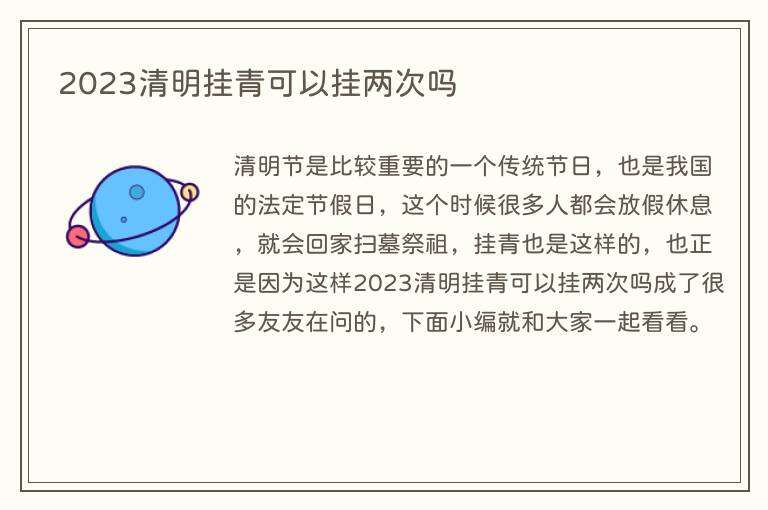 清明节是比较重要的一个传统节日,也是我国的法定节假日,这个时候很多人都会放假休息,就会回家扫墓祭祖,挂青也是这样的,也正是因为这样2023清明挂青可以挂两次吗成了很多友友在问的,下面小编就和大家一起看看。