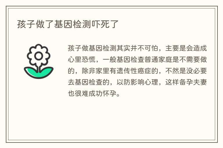 孩子做基因检测其实并不可怕,主要是会造成心里恐慌,一般基因检查普通家庭是不需要做的,除非家里有遗传性癌症的,不然是没必要去基因检查的,以防影响心理,这样备孕夫妻也很难成功怀孕。