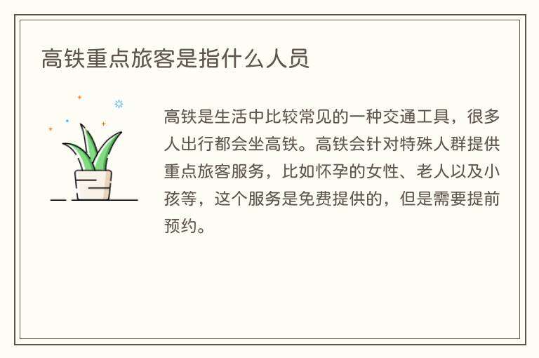 高铁是生活中比较常见的一种交通工具,很多人出行都会坐高铁。高铁会针对特殊人群提供重点旅客服务,比如怀孕的女性、老人以及小孩等,这个服务是免费提供的,但是需要提前预约。