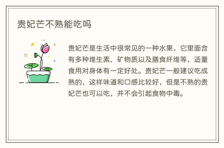 贵妃芒是生活中很常见的一种水果,它里面含有多种维生素、矿物质以及膳食纤维等,适量食用对身体有一定好处。贵妃芒一般建议吃成熟的,这样味道和口感比较好,但是不熟的贵妃芒也可以吃,并不会引起食物中毒。