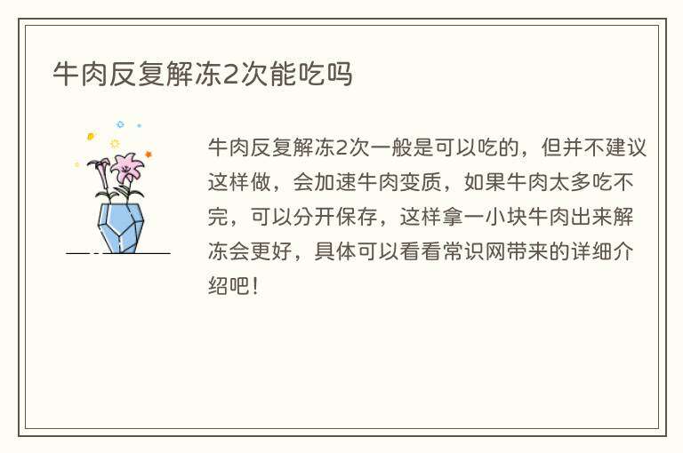牛肉反复解冻2次一般是可以吃的,但并不建议这样做,会加速牛肉变质,如果牛肉太多吃不完,可以分开保存,这样拿一小块牛肉出来解冻会更好,具体可以看看常识网带来的详细介绍吧!