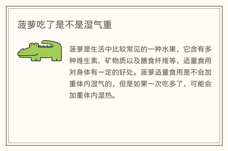 菠萝是生活中比较常见的一种水果,它含有多种维生素、矿物质以及膳食纤维等,适量食用对身体有一定的好处。菠萝适量食用是不会加重体内湿气的,但是如果一次吃多了,可能会加重体内湿热。
