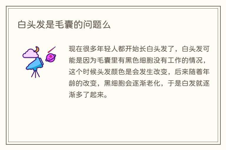 现在很多年轻人都开始长白头发了,白头发可能是因为毛囊里有黑色细胞没有工作的情况,这个时候头发颜色是会发生改变,后来随着年龄的改变,黑细胞会逐渐老化,于是白发就逐渐多了起来。