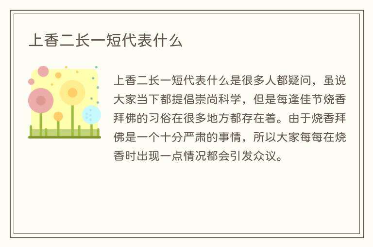 上香二长一短代表什么是很多人都疑问,虽说大家当下都提倡崇尚科学,但是每逢佳节烧香拜佛的习俗在很多地方都存在着。由于烧香拜佛是一个十分严肃的事情,所以大家每每在烧香时出现一点情况都会引发众议。