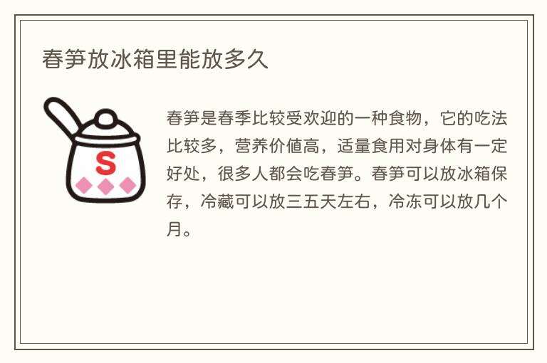 春笋是春季比较受欢迎的一种食物,它的吃法比较多,营养价值高,适量食用对身体有一定好处,很多人都会吃春笋。春笋可以放冰箱保存,冷藏可以放三五天左右,冷冻可以放几个月。