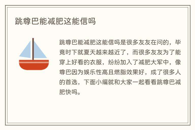 跳尊巴能减肥这能信吗是很多友友在问的,毕竟时下就夏天越来越近了,而很多友友为了能穿上好看的衣服,纷纷加入了减肥大军中,像尊巴因为娱乐性高且燃脂效果好,成了很多人的首选,下面小编就和大家一起看看跳尊巴减肥快吗。