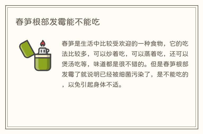 春笋是生活中比较受欢迎的一种食物,它的吃法比较多,可以炒着吃,可以蒸着吃,还可以煲汤吃等,味道都是很不错的。但是春笋根部发霉了就说明已经被细菌污染了,是不能吃的,以免引起身体不适。