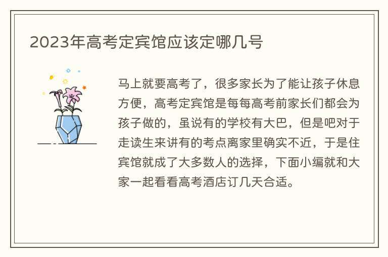 高考定宾馆应该定6月6、7、8这三天,但由于有的地方是两天,所以定到7号就可以了,之所以家长会这么做主要是为了孩子中午休息方便。而且订好房间的家长和考生可以提前入住这样能让考生尽快适应新的居住环境和往返路线,找到考试的感觉。