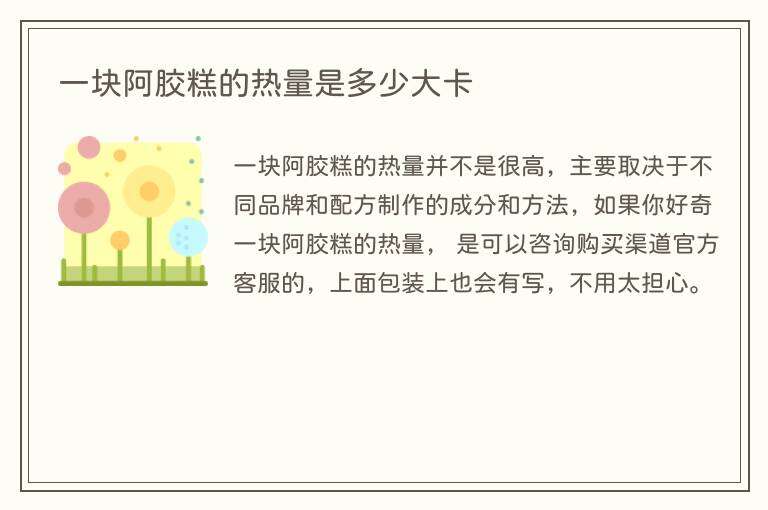 一块阿胶糕的热量大约在100至150千卡之间,具体取决于不同品牌和配方的阿胶糕的制作方法和成分。如果您关心具体的热量含量,建议查看阿胶糕包装上的营养成分表或者向生产商咨询。