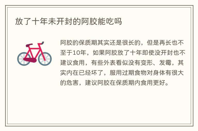 阿胶的保质期其实还是很长的,但是再长也不至于10年,如果阿胶放了十年即使没开封也不建议食用,有些外表看似没有变形、发霉,其实内在已经坏了,服用过期食物对身体有很大的危害,建议阿胶在保质期内食用更好。