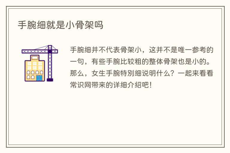 手腕细并不代表骨架小,这并不是唯一参考的一句,有些手腕比较粗的整体骨架也是小的。那么,女生手腕特别细说明什么?一起来看看常识网带来的详细介绍吧!