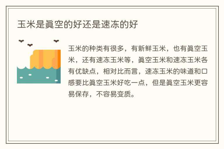玉米的种类有很多,有新鲜玉米,也有真空玉米,还有速冻玉米等,真空玉米和速冻玉米各有优缺点,相对比而言,速冻玉米的味道和口感要比真空玉米好吃一点,但是真空玉米更容易保存,不容易变质。
