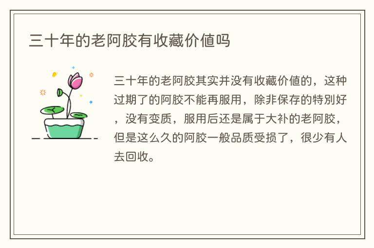三十年的老阿胶其实并没有收藏价值的,这种过期了的阿胶不能再服用,除非保存的特别好,没有变质,服用后还是属于大补的老阿胶,但是这么久的阿胶一般品质受损了,很少有人去回收。