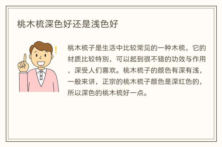 桃木梳子是生活中比较常见的一种木梳,它的材质比较特别,可以起到很不错的功效与作用,深受人们喜欢。桃木梳子的颜色有深有浅,一般来讲,正宗的桃木梳子颜色是深红色的,所以深色的桃木梳好一点。
