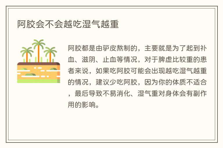 阿胶都是由驴皮熬制的,主要就是为了起到补血、滋阴、止血等情况,对于脾虚比较重的患者来说,如果吃阿胶可能会出现越吃湿气越重的情况,建议少吃阿胶,因为你的体质不适合,最后导致不易消化、湿气重对身体会有副作用的影响。