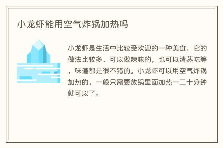 小龙虾是生活中比较受欢迎的一种美食,它的做法比较多,可以做辣味的,也可以清蒸吃等,味道都是很不错的。小龙虾可以用空气炸锅加热的,一般只需要放锅里面加热一二十分钟就可以了。
