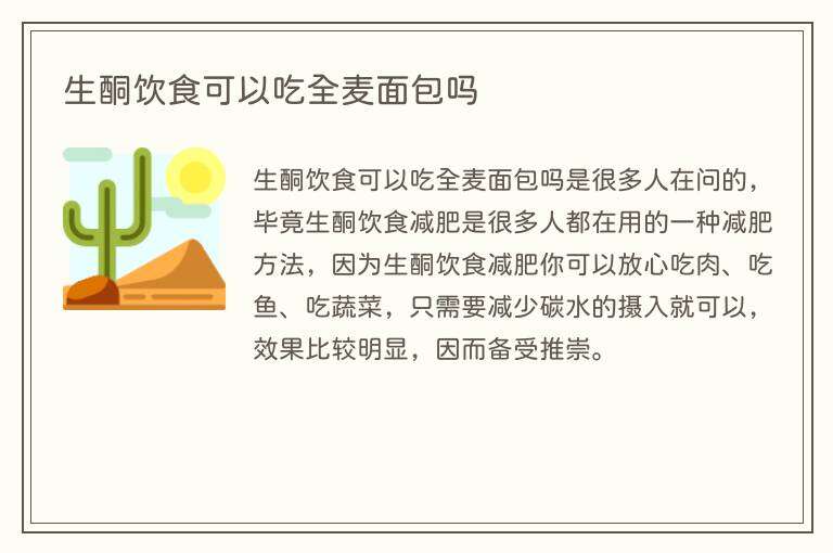 生酮饮食一般不建议吃全麦面包,以免导致生酮饮食的效果受到影响。并且生活中不是所有人群都适合生酮饮食,建议在专业医生评估下,选择是否进行生酮饮食。生酮期间,正餐最简单的吃法,和平时吃的一样,只是把主食丢掉。 主食包括:米饭、包子、饺子、馒头、油条、面条、面包等等。 所以叫外卖的话,要避开主食,选择碳水低,无蔗糖高脂肪的菜品。 比如烧腊,烧鸡,烤鸭,烧肉,油鸡等,可以选择点小炒肉,回锅肉。