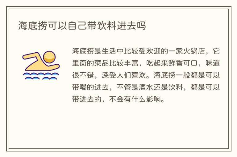 海底捞是生活中比较受欢迎的一家火锅店,它里面的菜品比较丰富,吃起来鲜香可口,味道很不错,深受人们喜欢。海底捞一般都是可以带喝的进去,不管是酒水还是饮料,都是可以带进去的,不会有什么影响。