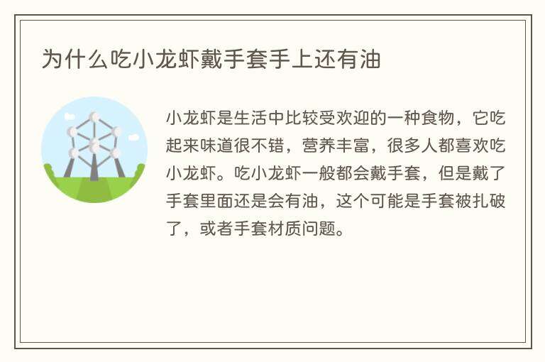 小龙虾是生活中比较受欢迎的一种食物,它吃起来味道很不错,营养丰富,很多人都喜欢吃小龙虾。吃小龙虾一般都会戴手套,但是戴了手套里面还是会有油,这个可能是手套被扎破了,或者手套材质问题。