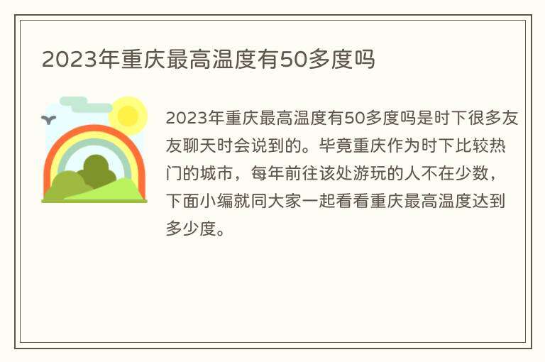 2023年重庆最高温度有50多度吗是时下很多友友聊天时会说到的。毕竟重庆作为时下比较热门的城市,每年前往该处游玩的人不在少数,下面小编就同大家一起看看重庆最高温度达到多少度。