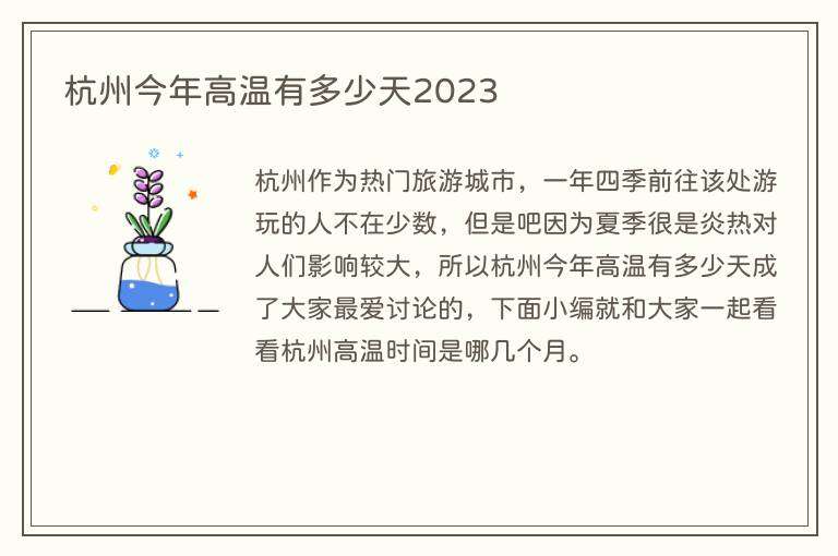 杭州作为热门旅游城市,一年四季前往该处游玩的人不在少数,但是吧因为夏季很是炎热对人们影响较大,所以杭州今年高温有多少天成了大家最爱讨论的,下面小编就和大家一起看看杭州高温时间是哪几个月。