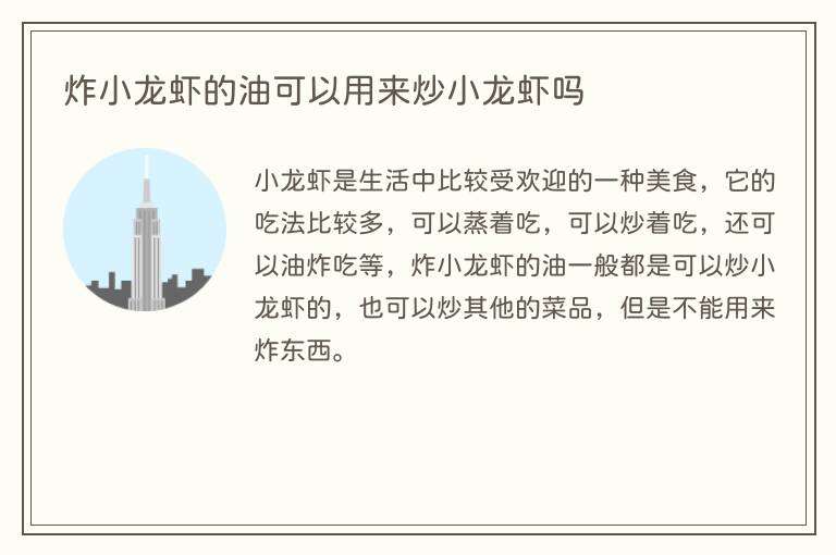 小龙虾是生活中比较受欢迎的一种美食,它的吃法比较多,可以蒸着吃,可以炒着吃,还可以油炸吃等,炸小龙虾的油一般都是可以炒小龙虾的,也可以炒其他的菜品,但是不能用来炸东西。
