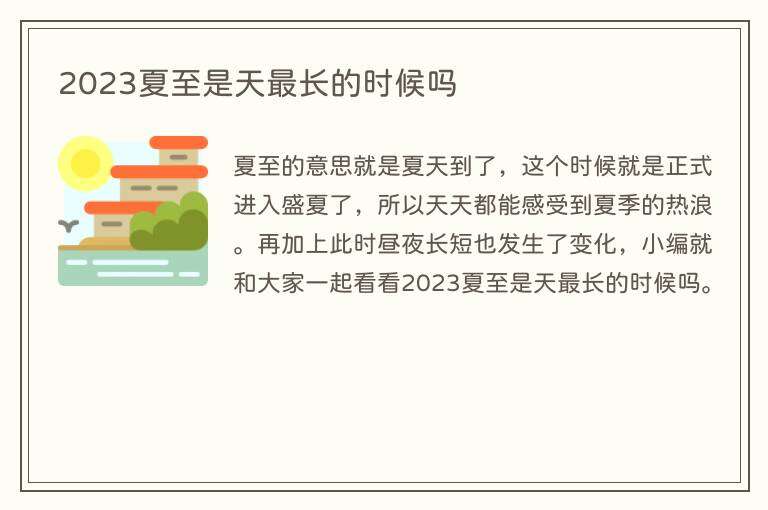 夏至的意思就是夏天到了,这个时候就是正式进入盛夏了,所以天天都能感受到夏季的热浪。再加上此时昼夜长短也发生了变化,小编就和大家一起看看2023夏至是天最长的时候吗。