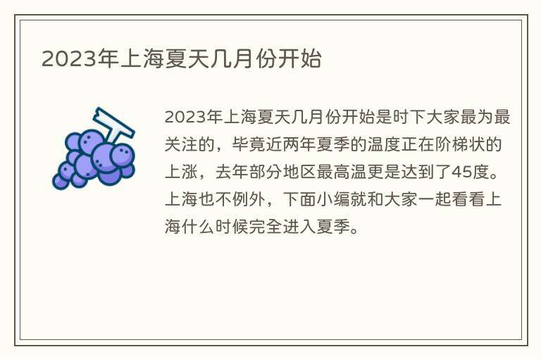 2023年上海夏天几月份开始是时下大家最为最关注的,毕竟近两年夏季的温度正在阶梯状的上涨,去年部分地区最高温更是达到了45度。上海也不例外,下面小编就和大家一起看看上海什么时候完全进入夏季。