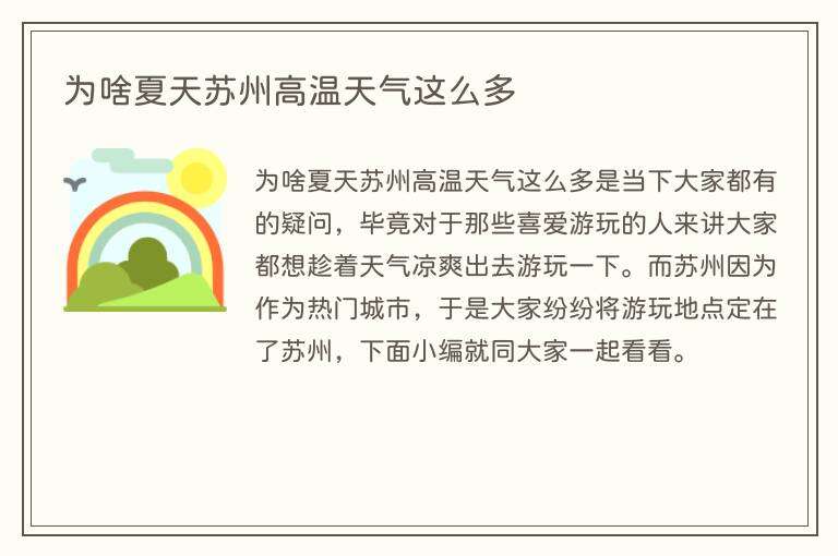 为啥夏天苏州高温天气这么多是当下大家都有的疑问,毕竟对于那些喜爱游玩的人来讲大家都想趁着天气凉爽出去游玩一下。而苏州因为作为热门城市,于是大家纷纷将游玩地点定在了苏州,下面小编就同大家一起看看。