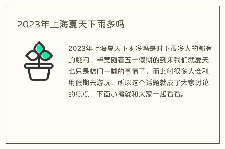 2023年上海夏天下雨多吗是时下很多人的都有的疑问,毕竟随着五一假期的到来我们就夏天也只是临门一脚的事情了,而此时很多人会利用假期去游玩,所以这个话题就成了大家讨论的焦点,下面小编就和大家一起看看。