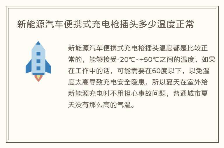新能源汽车便携式充电枪插头温度都是比较正常的,能够接受-20℃~+50℃之间的温度,如果在工作中的话,可能需要在60度以下,以免温度太高导致充电安全隐患,所以夏天在室外给新能源充电时不用担心事故问题,普通城市夏天没有那么高的气温。