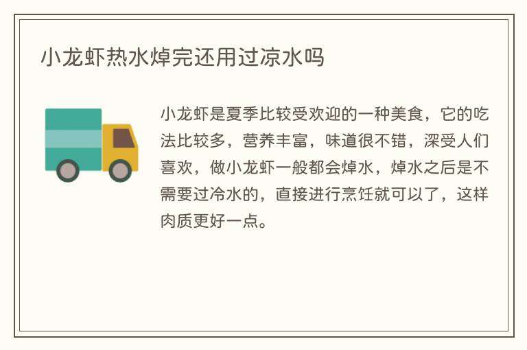 小龙虾是夏季比较受欢迎的一种美食,它的吃法比较多,营养丰富,味道很不错,深受人们喜欢,做小龙虾一般都会焯水,焯水之后是不需要过冷水的,直接进行烹饪就可以了,这样肉质更好一点。