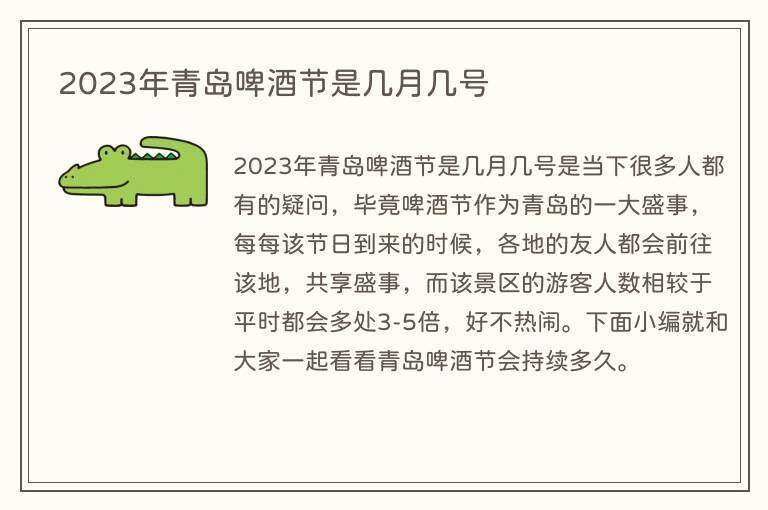 2023年青岛啤酒节是几月几号是当下很多人都有的疑问,毕竟啤酒节作为青岛的一大盛事,每每该节日到来的时候,各地的友人都会前往该地,共享盛事,而该景区的游客人数相较于平时都会多处3-5倍,好不热闹。下面小编就和大家一起看看青岛啤酒节会持续多久。