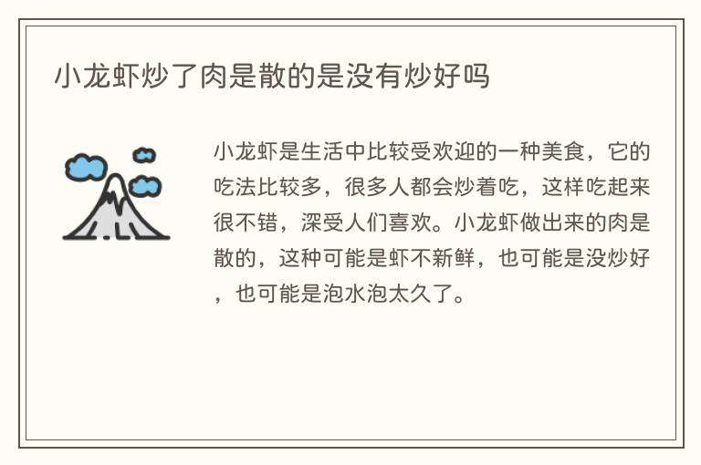 小龙虾是生活中比较受欢迎的一种美食,它的吃法比较多,很多人都会炒着吃,这样吃起来很不错,深受人们喜欢。小龙虾做出来的肉是散的,这种可能是虾不新鲜,也可能是没炒好,也可能是泡水泡太久了。