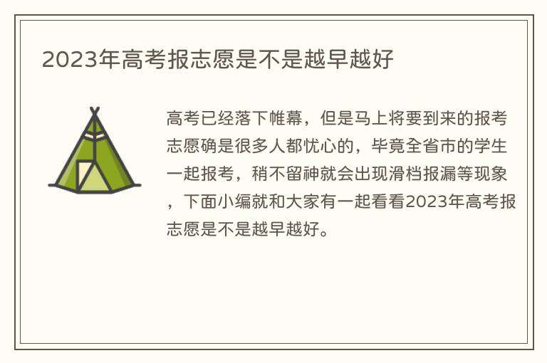 高考已经落下帷幕,但是马上将要到来的报考志愿确是很多人都忧心的,毕竟全省市的学生一起报考,稍不留神就会出现滑档报漏等现象,下面小编就和大家有一起看看2023年高考报志愿是不是越早越好。