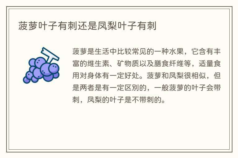 菠萝是生活中比较常见的一种水果,它含有丰富的维生素、矿物质以及膳食纤维等,适量食用对身体有一定好处。菠萝和凤梨很相似,但是两者是有一定区别的,一般菠萝的叶子会带刺,凤梨的叶子是不带刺的。