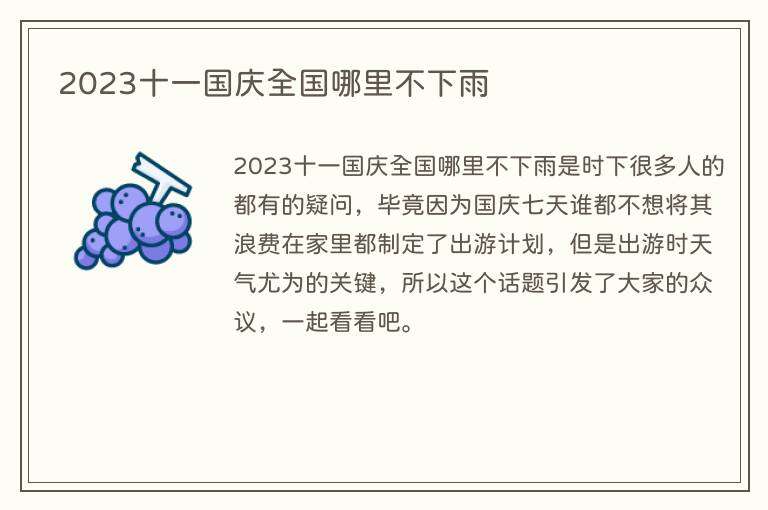 2023十一国庆全国哪里不下雨是时下很多人的都有的疑问,毕竟因为国庆七天谁都不想将其浪费在家里都制定了出游计划,但是出游时天气尤为的关键,所以这个话题引发了大家的众议,一起看看吧。