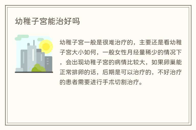 幼稚子宫一般是很难治疗的,主要还是看幼稚子宫大小如何,一般女性月经量稀少的情况下,会出现幼稚子宫的病情比较大,如果卵巢能正常排卵的话,后期是可以治疗的,不好治疗的患者需要进行手术切割治疗。