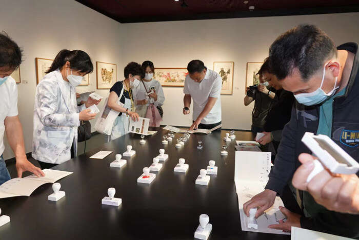5月13日下午,在中央音乐学院民族室内乐团的精彩演绎中,木版水印非遗体验周活动启动仪式拉开帷幕。一曲民乐合奏《春碧》,用柔美而悠扬的国风曲调呈现中华音乐魅力,特别是几位乐者身着古装,恍若《韩熙载夜宴图》的画中人,把现场观众带回千年前的那场雅宴之上。伴随着雅韵之声,本次展览的策展人与木版水印的非遗传承人用精彩而具有学术性的导赏和传统技艺的活态展示为观众倾情呈现了一场文化盛宴。展览现场,策展人对展览进行了全面的介绍,观众可以了解木版水印发展的历史,以及张大千、徐悲鸿等艺术大师们与荣宝斋的不解之缘。非遗传承人还在展览现场邀请观众一同参与制作印刷,让木版水印这项传承百年的国家级非物质文化遗产走进百姓生活之中,彰显了大国工匠精神。在活动的最后,策展方准备了从荣宝斋经典木版水印作品中提取具有代表性图案的印章,如《簪花仕女图》中的仕女形象,《韩熙载夜宴图》中“吹箫引凤”的局部,齐白石的虾和蟹,《十竹斋笺谱》中“梅兰竹菊”等图案,供观众自由发挥印制属于自己的集章打卡作品留作纪念。