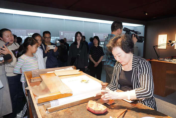 国家级非遗传承人高文英女士为观众现场展示木版水印技艺