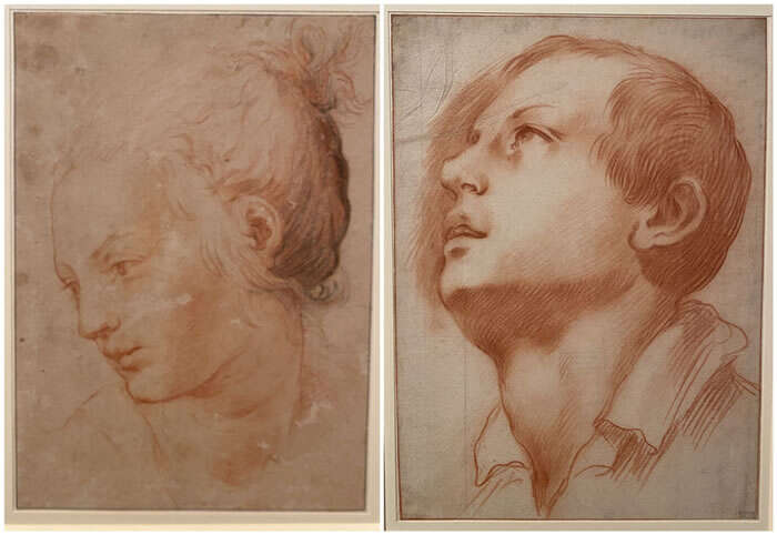 真蒂莱斯基(存疑),素描,左图:“拉斐尔作品中年轻女子的头部习作”,约1640;右图:“年轻男子”,约1630-1640