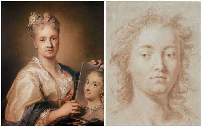 罗萨尔巴•卡列拉(RosalbaCarriera,1673-1757),自画像,左图*:1715年或1709年,意大利搜罗伦斯乌菲兹美术馆馆藏(Uffizi Gallery);右图:约1708,私人收藏